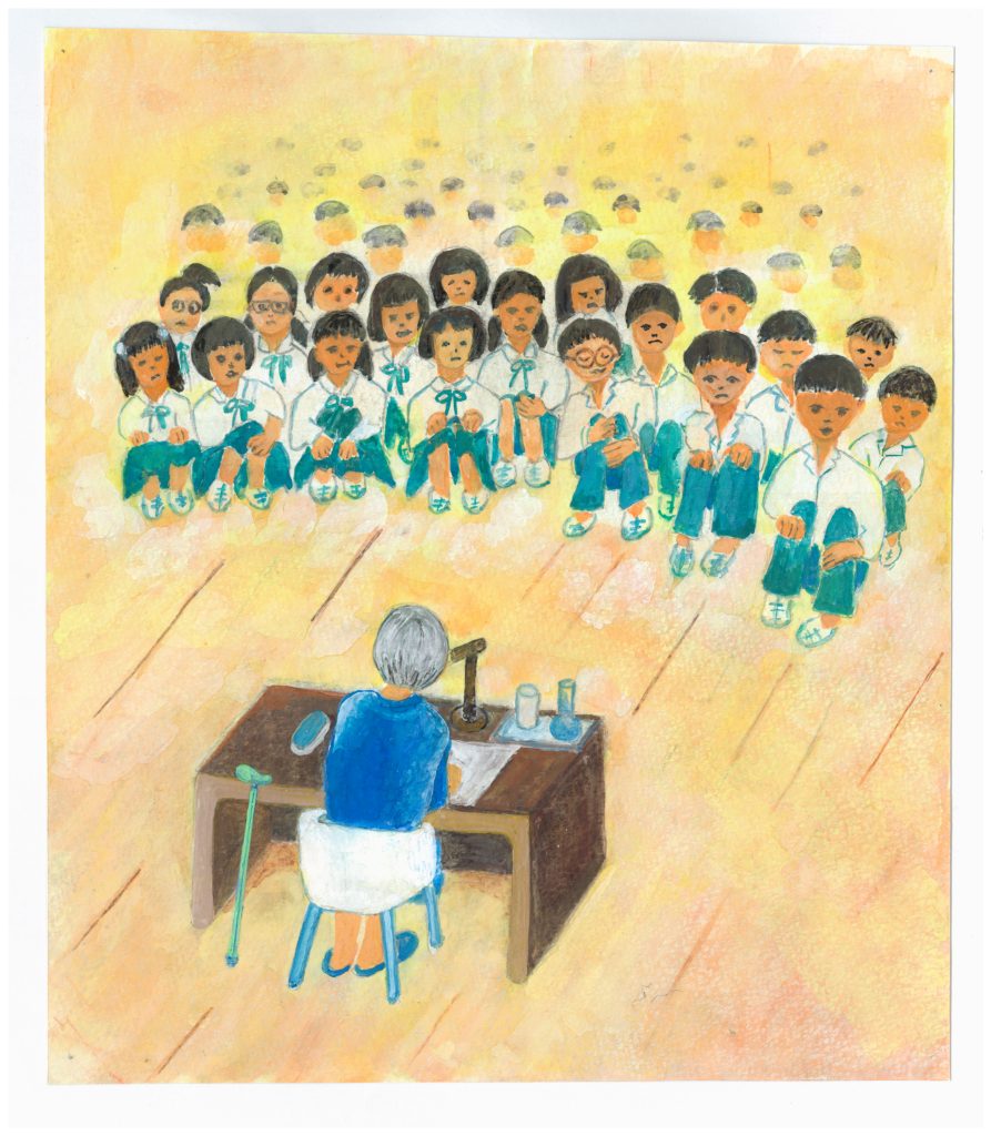 当日は、いたみ止めの注射を打って夫の公照さんに体を支えてもらいながら、二人で何日もかけて用意した原稿を持って、あのつらい被爆体験を、初めて人に話すために中学校へ行きました。