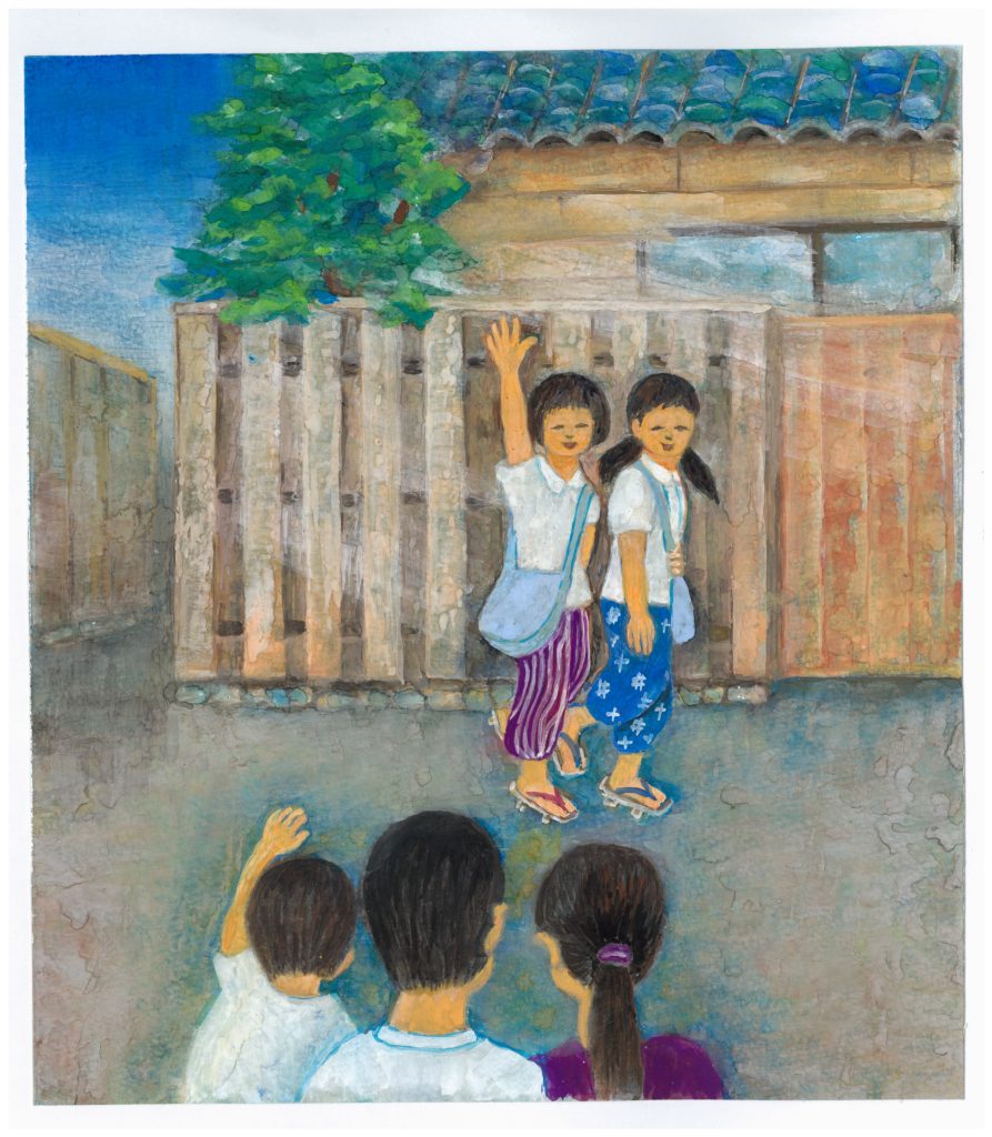 清子さんは家族三人に見送られて、同じように家の都合で疎開していない近所に住む仲良しの和子さんといっしょに、おどるような気分で学校に向かいました。