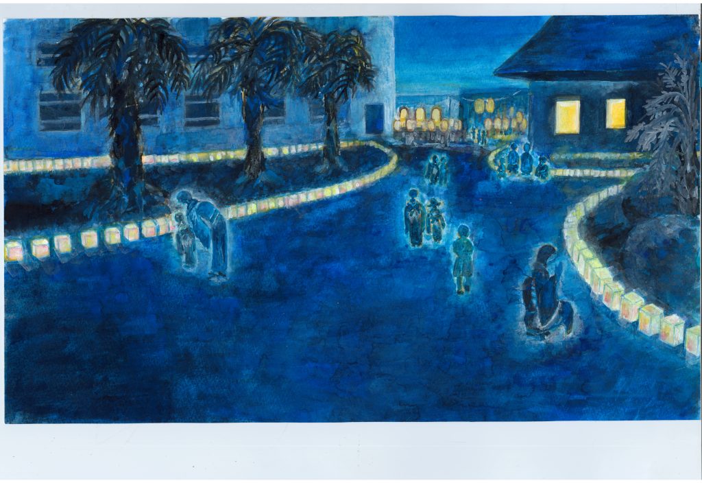 暗闇を照らすやわらかな灯篭の灯が、清子さんと子どもたちのすがたをおだやかにつつんでいました。