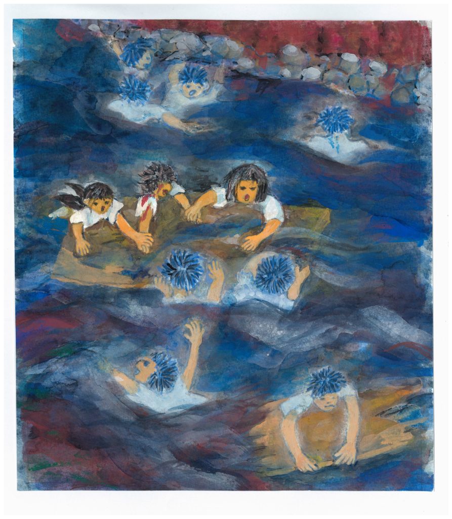 やがて声を出す元気もなくなりそのまま水にしずむ人、すでにあおむけになってういている人、人、人でいっぱいです。